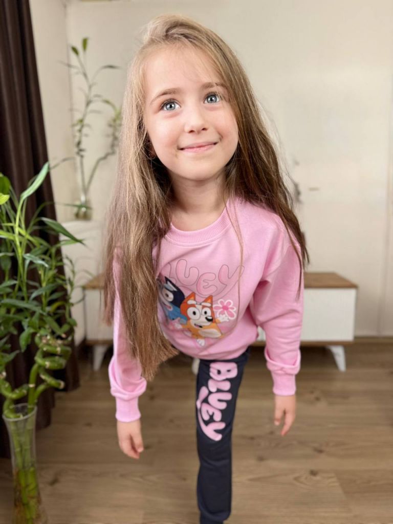 Детски комплект Koçak Kids Bluey – блуза и панталон, розов/сив, 6–7 години