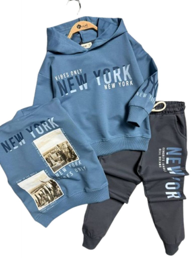 Суитшъртът е с качулка и модерна щампа New York, а панталонът е с ластик на талията за лесно обличане и удобство през целия ден.