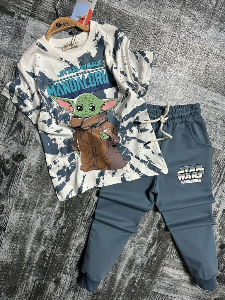 Детски комплект за момче с щампа на анимационен герой.Комплектът включва долнище с дълъг крачол и тениска с къс ръкав от памучна материя.Размери 3/10 години.Производител Турция.