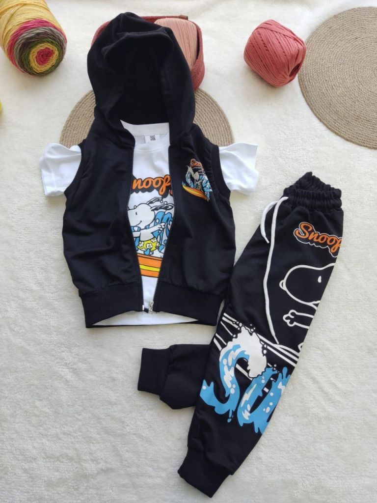 Детски комплект за момче с щампа на анимационен герой.Комплектът включва долнище с дълъг крачол, тениска с къс ръкав и елек с качулка.Размери 3/8 години.Памучна материя.Производител Турция.