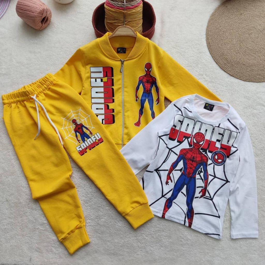 Детски комплект за момче с щампа на анимационен герой.Комплектът включва три части,горнище с дълъг ръкав, тениска с дълъг ръкав и спортен панталон с дълъг крачол.Изработен е от удобна, памучна материя.Размери 5/10 години.Производител Турция.