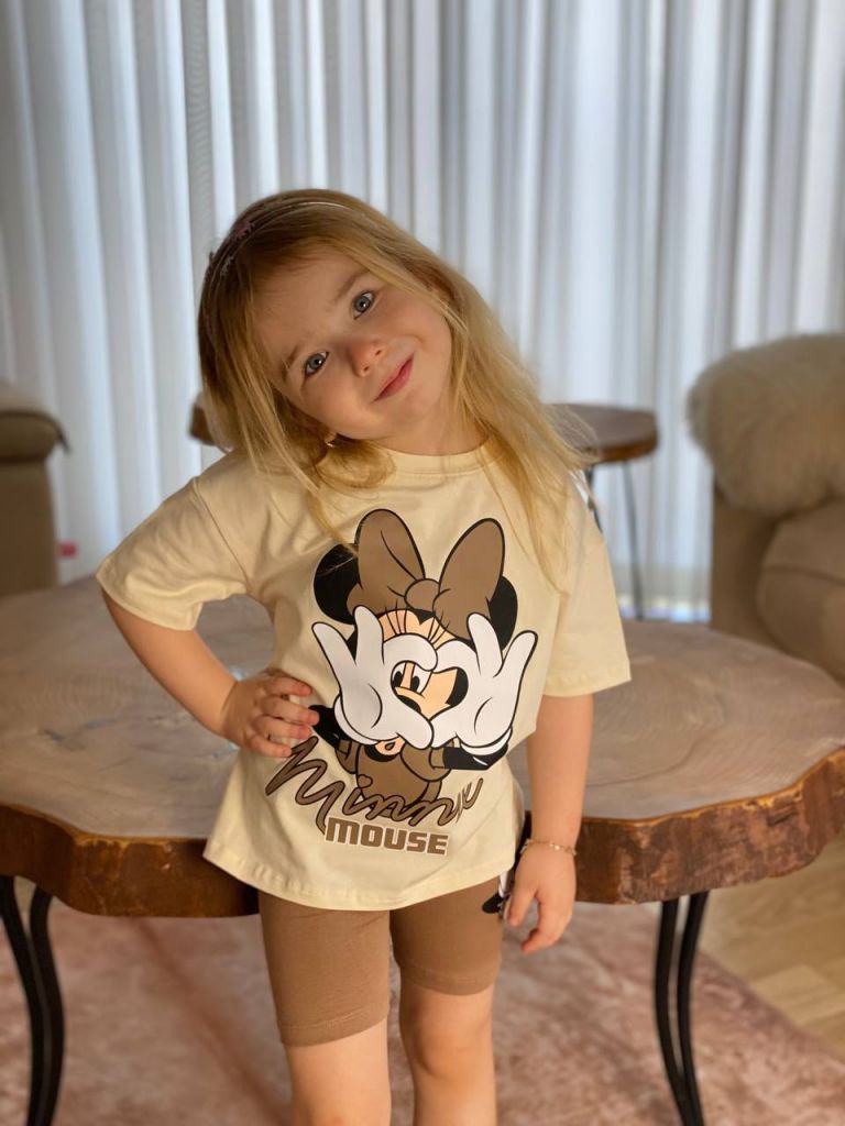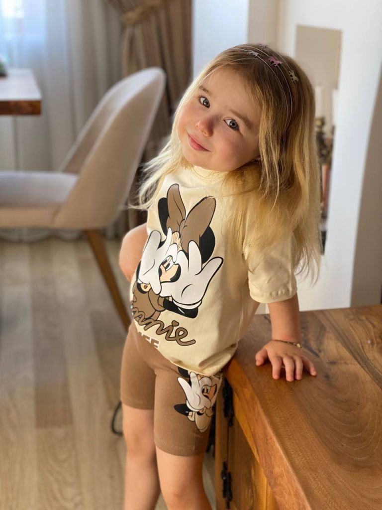 Детски комплект за момиче от две части, тениска с къс ръкав и къс клин с щампи, памучна материя.Размери 3/4,4/5,5/6,6/7,7/8 и 9/10 години.Производител Турция.